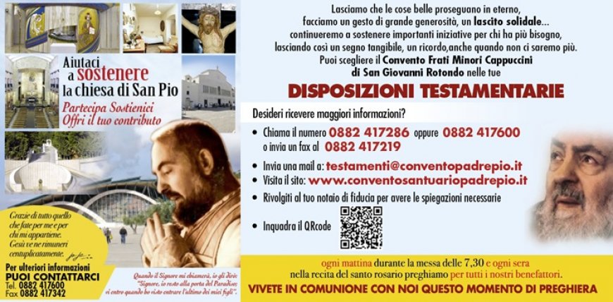Con voi gioiamo e rendiamo grazie a Dio per il dono splendido di San Pio e insieme affidarci alla sua intercessione. Come Frati Minori Cappuccini custodiamo e rendiamo presente l'esperienza di santità di San Pio e la sua spiritualità nel costante desiderio di lavorare per il Regno di Dio e di realizzare iniziative e progetti concreti finalizzati a rendere più bella la casa di Dio e a offrire nuove e migliori opportunità di accoglienza e di evangelizzazione. Dopo la realizzazione del Progetto Mosaico della Chiesa Inferiore che custodisce il corpo del Santo e l'inaugurazione degli affreschi della Cappella dell'Adorazione, è giunto il momento di presentarvi il Progetto Artistico delle Vetrate, che arricchirà e renderà ancora più bella e splendida la chiesa di San Pio. Da soli non ce la facciamo. Insieme tutto è possibile. Confidiamo, pertanto, nel vostro amore e nella vostra devozione verso San Pio e vi chiediamo di starci vicino, di aiutarci, di partecipare e di sostenerci nella realizzazione di questo nuovo progetto, che davvero si prospetta meraviglioso e unico. Siamo convinti che i sogni e i progetti nascono per essere condivisi e vederli realizzati.